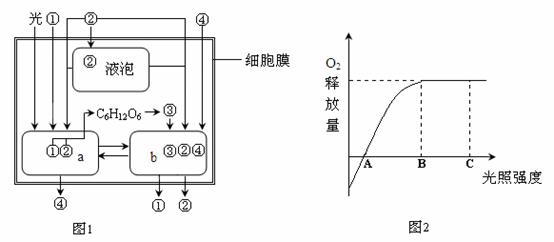 图1表示一个水稻成熟叶肉细胞代谢的某些过程(图中数字代表物质, a、b代表细胞器)。图2表示在温度、水分都最适宜时,水稻O2释放量与光照强度的关系。请据图回答问题:![]()