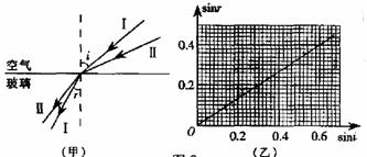如图(甲)所示,光I从空气斜射如玻璃中,发生了折射现象,从图中可以看出折射角r小于入射角i。那么,一般情况下,i与r有什么定量关系呢?1621年,荷兰学者斯涅尔通过实验终于找到了i与r之间的规律,如图是光从空气进入玻璃中时,利用实验数据得到的sinr与sini的关系图象。