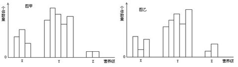 6.经调查,某生态系统中Y、X、Z分别为第一、第二和第三营养级,每个营养级不同物种的个体数量如图甲所示(图中每一柱条代表一个物种)。一段时间后个体数量发生变化,结果如图乙所示。