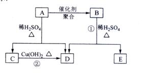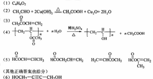 [解析]本题考查有机物的结构推断和性质,注意结构简式、同分异构体、化学方程式的书写。根据题意,A分子中碳的原子数为4个,氢原子的个数为6个,则氧原子的个数为2个,即A的分子式为C4H6O2。由于A可以发生聚合反应,说明含有碳碳双键,在硫酸存在条件下生成两种有机物,则为酯的水解,即A中含有酯基。根据不饱和度,没有其他功能团。由A的水解产物C和D的关系可判断C与D中的碳原子数相等,均为两个。则A的结构为CH3COOCH=CH2,因此A在酸性条件下水解后得到CH3COOH和CH2=CHOH,碳碳双键的碳原子上接羟基不稳定,转化为CH3CHO。A聚合反应后得到的产物B为