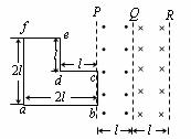 5、如图所示,在PQ、QR区域中存在着磁感应强度大小相等、方向相反的匀强磁场,磁场方向均垂直于纸面。一导线框abcdef位于纸面内,况的邻边都相互垂直,bc边与磁场的边界P重合。导线框与磁场区域的尺寸如图所示。从t=0时刻开始,线框匀速横穿两个磁场区域。以a→b→c→d→e→f为线框中的电动势ε的正方向,以下四个ε-t关系示意图中正确的是 ![]()