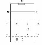 3.如图3所示,两根竖直放置的光滑平行导轨,其一部分处于方向垂直导轨所在平面且有上下水平边界的匀强磁场中,一根金属杆MN成水平沿导轨滑下,在与导轨和电阻R组成的闭合电路中,其他电阻不计。当金属杆MN进入磁场区后,其运动的速度图像可能是下图中的