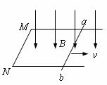 6、如图所示,足够长的两光滑导轨水平放置,两条导, 轨相距为d,左端MN用阻值不计的导线相连,金属棒ab可在导轨上滑动,导轨单位长度的电阻为r0,金属棒ab的电阻不计。整个装置处于竖直向下的均匀磁场中,磁场的磁感应强度随时间均匀增加,B=kt,其中k为常数。金属棒ab在水平外力的作用下,以速度v沿导轨向右做匀速运动,t=0时,金属棒ab与MN相距非常近.求: