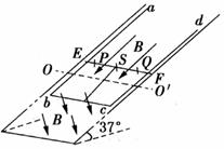 7、如图所示,倾角为370的光滑绝缘的斜面上放着M=1kg的导轨abcd,ab∥cd。另有一质量m=1kg的金属棒EF平行bc放在导轨上,EF下侧有绝缘的垂直于斜面的立柱P、S、Q挡住EF使之不下滑,以OO′为界,斜面左边有一垂直于斜面向下的匀强磁场。右边有平行于斜面向下的匀强磁场,两磁场的磁感应强度均为B=1T,导轨bc段长L=1m。金属棒EF的电阻R=1.2Ω,其余电阻不计,金属棒与导轨间的动摩擦因数μ=0.4,开始时导轨bc边用细线系在立柱S上,导轨和斜面足够长,当剪断细线后,试求: