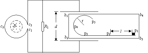31、(2009年四川卷)24.如图所示,直线形挡板p1p2p3与半径为r的圆弧形挡板p3p4p5平滑连接并安装在水平台面b1b2b3b4上,挡板与台面均固定不动。线圈c1c2c3的匝数为n,其端点c1、c3通过导线分别与电阻R1和平行板电容器相连,电容器两极板间的距离为d,电阻R1的阻值是线圈c1c2c3阻值的2倍,其余电阻不计,线圈c1c2c3内有一面积为S、方向垂直于线圈平面向上的匀强磁场,磁场的磁感应强度B随时间均匀增大。质量为m的小滑块带正电,电荷量始终保持为q,在水平台面上以初速度v0从p1位置出发,沿挡板运动并通过p5位置。若电容器两板间的电场为匀强电场,p1、p2在电场外,间距为L,其间小滑块与台面的动摩擦因数为μ,其余部分的摩擦不计,重力加速度为g.