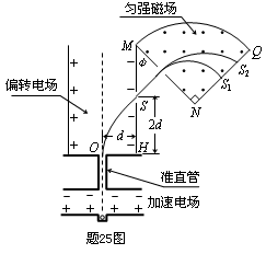 (2009年重庆卷)25.如题25图,离子源A产生的初速为零、带电量均为e、质量不同的正离子被电压为U0的加速电场加速后匀速通过准直管,垂直射入匀强偏转电场,偏转后通过极板HM上的小孔S离开电场,经过一段匀速直线运动,垂直于边界MN进入磁感应强度为B的匀强磁场。已知HO=d,HS=2d,