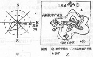 下图反映位于平原地区的某城地.价分布,甲图表示该市风向频率,乙图中地价等值线数值a、b、C、d、e依次递减.据图回答19题。