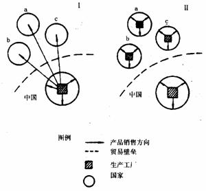 下图表示我国某工业公司向异国发展的过程。a、b、c三国均为发达国家。第I阶段,该公司将国内生产的产品销往a、b、c三国;第II阶段,该公司分别在a、b、c三国投资设厂,以避开贸易壁垒。