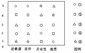 下图,纵坐标1-5代表各种运输方式四项指标的比较,1-5代表由优到劣的大体次序,回答69题。