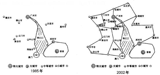 (1) 从1985年到2002年,珠江三角洲城市化发展快。其城市化过程具体表现在 、