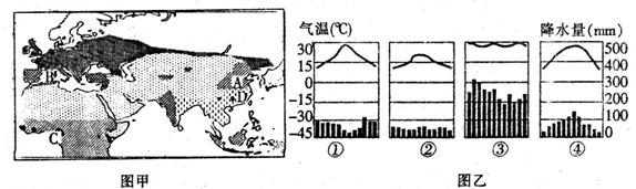 72.图甲为世界部分地区主要农业生产地域类型图,图乙为四幅不同气候类型的降水量和气温的月份分配图,读图回答下列问题。(10分)