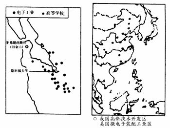 73.左图为美国硅谷图,右图为我国高新技术开发区及美国微电子装配工业在东南亚、港、澳、台分布图,读图回答问题。(10分)