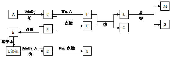 已知:①C、D、E都是短周期元素的单质,在常温常压下均为气体,其中E在D中燃烧发出苍白色火焰。②化合物F为淡黄色固体,化合物M是家用消毒剂的主要成分。③化合物A和H都由甲、乙两种元素组成,且在A和H中甲、乙两种元素的原子个数比分别为1 : 1和2 : 1。