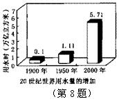 (1)由20世纪用水量(工业、农业、城市居民用水总量)的增加示意图可知,世界用水量在20世纪中的后50年的平均增长量约为前50年的平均增长量的 倍。