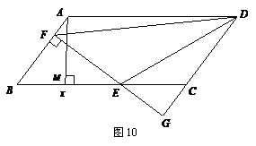 10.(2008湖南郴州)如图10,平行四边形ABCD中,AB=5,BC=10,BC边上的高AM=4,E为 BC边上的一个动点(不与B、C重合).过E作直线AB的垂线,垂足为F. FE与DC的延长线相交于点G,连结DE,DF..