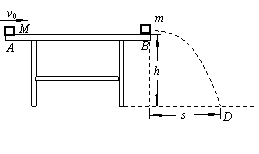 31.(2009东城区期末试题) 如图所示,在距水平地面高h=0.80m的水平桌面一端的边缘放置一个质量m=0.80kg的木块B,桌面的另一端有一块质量M=1.0kg的木块A以初速度v0=4.0m/s开始向着木块B滑动,经过时间t=0.80s与B发生碰撞,碰后两木块都落到地面上。木块B离开桌面后落到地面上的D点。设两木块均可以看作质点,它们的碰撞时间极短,且已知D点距桌面边缘的水平距离s=0.60m,木块A与桌面间的动摩擦因数μ=0.25,重力加速度取g=10m/s2。求: