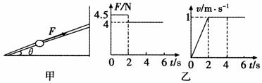 7.(08合肥第一次教学质检)如图甲所示,足够长的固定光滑细杆与地面成一定倾角,在杆上套有一个光滑小环,小环在沿杆方向的推力F作用下向上运动,推力F及小环速度v随时间变化规律如图乙所示,取重力加速度g=10 m/s2.则以下判断正确的是 ( )