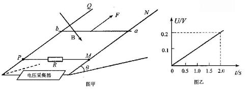 =30°,两导轨间距L=0.3m。导轨电阻忽略不计,其间连接有阻值R=0.4Ω的固定电阻。开始时,导轨上固定着一质量m=0.1kg、电阻r=0.2Ω的金属杆ab,整个装置处于磁感应强度B=0.5T的匀强磁场中,磁场方向垂直导轨面向下。现拆除对金属杆ab的约束,同时用一平行金属导轨面的外力F沿斜面向上拉金属杆ab,使之由静止开始向上运动。电压采集器可将其两端的电压U即时采集并输入电脑,获得的电压U随时间t变化的关系如图乙所示。求: