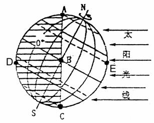33.读“地球太阳光照”图,回答下列问题:(10分)
