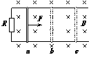水平面内两光滑的平行金属导轨,左端与电阻R相连接,匀强磁场B竖直向下分布在导轨所在的空间内,质量一定的金属棒垂直于导轨并与导轨接触良好。今对棒施加一个水平向右的外力F,使金属棒从a位置开始,向右做初速度为零的匀加速运动并依次通过位置b和c。若导轨与棒的电阻不计,a到b与b到c的距离相等,则关于金属棒在运动过程中的有关说法,正确的是( )