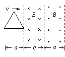 如图所示,一个边长为a、电阻为R的等边三角形线框,在外力作用下,以速度v匀速穿过宽均为a的两个匀强磁场.这两个磁场的磁感应强度大小均为B方向相反.线框运动方向与底边平行且与磁场边缘垂直.取逆时针方向的电流为正。若从图示位置开始,线框中产生的感应电流I与沿运动方向的位移x之间的函数图象,下面四个图中正确的是(