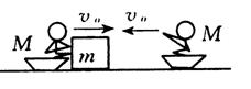 7.甲、乙两个小孩各乘一辆冰车在水平冰面上游戏,甲和他的冰车总质量共为M =30 kg,乙和他的冰车总质量也是30 kg,游戏时,甲推着一个质量m =15 kg的箱子,和他一起以大小为V0=2m/s的速度滑行,乙以同样大小的速度迎面滑来,如图,为了避免相撞,甲突然将箱子沿冰面推给乙,箱子滑到乙处时乙迅速把它抓住,若不计冰面的摩擦,问甲至少要以多大的速度(相对地面)将箱子推出,才能避免与乙相撞.(注意两人避免相撞的条件)
