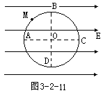 9、如图3-2-11所示,在竖直平面内,有一半径为R的绝缘的光滑圆环,圆环处于场强大小为E,方向水平向右的匀强电场中,圆环上的A、C两点处于同一水平面上,B、D分别为圆环的最高点和最低点.M为圆环上的一点,∠MOA=45°.环上穿着一个质量为m,带电量为+q的小球,它正在圆环上做圆周运动,已知电场力大小qE等于重力的大小mg,且小球经过M点时球与环之间的相互作用力为零.试确定小球经过A、B、C、D点时的动能各是多少?