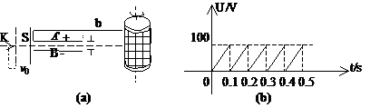 10、如图3(a)所示,真空室中电极K发出的电子(初速为零)。经U=1000V的加速电场后,由小孔S沿两水平金属板A、B两板间的中心线射入,A、B板长L=0.20m,相距d=0.020m,加在A、B两板间的电压U随时间t变化u-t图线如图3(b)。设A、B两板间的电场可以看做是均匀的,且两板外无电场。在每个电子通过电场区域的极短时间内,电场可视作恒定的。两板右侧放一记录圆筒,筒的左侧边缘与极板右端距离