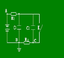 分析与解:我们从电路上看到,开关由闭合到断开,电容器上的电压发生变化,使电容器所带电量发生变化,这个变化要通过电容的充放电来实现,如果这个充放电电流要经过R1,那么我们就可以通过电容器带电量的变化来确定通过R1的电量。当K断开,稳定后,电路中没有电流,C1上板与A点等势,C点与B点等势,C1、C2两端电压均为电源电动势,所以