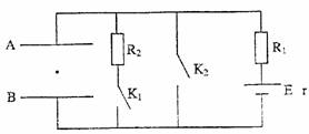 例题4、电源内阻r=2Ω,R1=8Ω,R2=10Ω,K1闭合,K2断开时,在相距d=70cm,水平放置的固定金属板AB间有一质量m=1.0g,带电量为q=7×10-5C的带负电的微粒,恰好静止在AB两板中央的位置上,求(1)电源的电动势(2)将K1断开0.1s后,又将K2闭合,微粒再经过多长时间与极板相碰。(g=10m/s2)