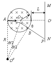 [例7]圆心为O、半径为r的圆形区域中有一个磁感强度为B、方向为垂直于纸面向里的匀强磁场,与区域边缘的最短距离为L的O'处有一竖直放置的荧屏MN,今有一质量为m的电子以速率v从左侧沿OO'方向垂直射入磁场,越出磁场后打在荧光屏上之P点,如图所示,求O'P的长度和电子通过磁场所用的时间。