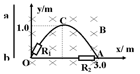 练习6、 如图所示,匀强磁场方向垂直纸面向里,磁感应强度B=0.20T,OCA金属导轨与OA金属直导轨分别在O点和A点接一阻值为R1 =3.0Ω和R2=6.0 Ω 体积可忽略的定值电阻,导轨OCA的曲线方程为 y=1.0sin(π/3· x) (m),金属棒ab平行于y 轴, 长为1.5m,以速度 v=5.0 m/s 水平向右匀速运动(b点始终在Ox轴上),设金属棒与导轨接触良好,摩擦不计,电路中除了电阻R1和R2外,其余电阻均不计,求: