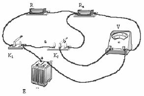 (8分)利用如图所示的一只电压表、一个电阻箱和一个电键,测量一个电池组的电动势和内电阻。画出实验电路图,并用笔画线作导线将所给器材连接成实验电路。用记录的实验数据写出电动势和内电阻的表达式。