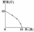 10.(2008·上海综合4)在经济学中,生产可能性曲线反映了在生产要素和生产技术既定时,所能生产出的各种产品的数量组合。下表记录了鲁滨逊独自在荒岛生活时一天所能获得的鱼和野果的数量,根据表中数据可绘制“鲁滨逊的生产可能性曲线”(见下图)。后来,鲁滨逊获得了一个奴隶“星期五”,“星期五”的捕鱼能力比采集野果的能力更强。两人一起工作时,新的生产可能性曲线是 ( )