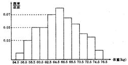 为了了解某地区高三学生的身体发育情况,抽查了该地区100名年龄为17.5岁-18岁的男生体重(kg),得到频率分布直方图如右图:
