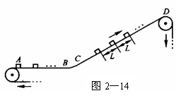 例10:一传送带装置示意如图2-14,其中传送带经过AB区域时是水平的,经过BC区域时变为圆弧形(圆弧由光滑模板形成,未画出),经过CD区域时是倾斜的,AB和CD都与BC相切。现将大量的质量均为m的小货箱一个一个在A处放到传送带上,放置时初速为零,经传送带运送到D处,D和A的高度差为h。稳定工作时传送带速度不变,CD段上各箱等距排列,相邻两箱的距离为L。每个箱子在A处投放后,在到达B之前已经相对于传送带静止,且以后也不再滑动(忽略经BC段时的微小滑动)。已知在一段相当长的时间T内,共运送小货箱的数目为N。这装置由电动机带动,传送带与轮子间无相对滑动,不计轮轴处的摩擦。求电动机的平均输出功率