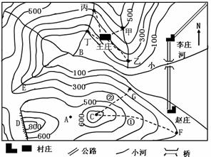 (3)王庄为了解决缺水,拟从山谷的河流中引水到王庄,图示中甲、乙、丙、丁四地为引水源地,综合多种因素,你认哪一引水源地最合适_____________地 (1分)