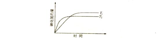 2HI(g),在温度T1和T2时,产物的量彧时间的关系如下图所示,符合图象的正确的判断是( )