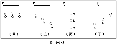 2.飞机水平匀速向西飞行,从飞机上间隔相等的时间内后落下a、b、c三个小球,若不计空气作用地面上的人看到三个小球在空中的排列位置应是图4-1-3中的