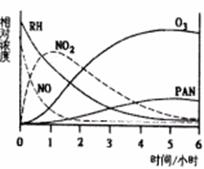 11.[豫南七校2008-2009学年度上期期末联考]某研究性学习小组,为研究光化学烟雾消长规律,在一烟雾实验箱中,测得烟雾的主要成分为RH(烃)、NO、NO2、O3、PAN(CH3COOONO2),各种物质的相对浓度随