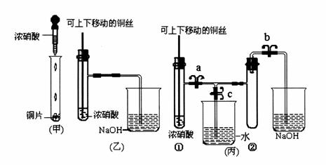 13.[豫南七校2008-2009学年度上期期末联考](8分)下图甲是课本中验证铜和浓硝酸反应的装置,乙、丙是师生对演示实验改进后的装置: