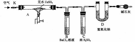 某研究性学习小组设计了下图所示装置(夹持仪器已略去),利用D管在反应前后的质量差计算分解的无水CuSO4的质量。