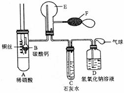 为了证明铜与稀硝酸反应产生一氧化氮,某校学生实验小组设计了一个实验,其装置如下图所示(加热装置和固定装置均已略去),B为一个用金属丝固定的干燥管,内装块状碳酸钙同体;E为一个空的蒸馏烧瓶;F是用于鼓入空气的双连打气球。
