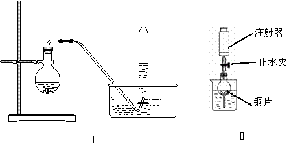 ⑶若用Ⅱ实验装置进行实验,以证明铜与稀硝酸反应生成的气体是NO。检查气密性的操作是 ;在烧杯中加入一定体积的稀硝酸,打开止水夹,用注射器慢慢抽取球形干燥管内的空气,稀硝酸沿着球形干燥管慢慢上升,直到充满整个球形干燥管,停止抽拉注射器,关闭止水夹,观察球形干燥管内的现象 。反应停止后,打开止水夹,用注射器抽取球形干燥管内的气体(事先已将注射器内原有的空气推出),关闭止水夹后取下注射器,并抽取一定量的空气,观察到的现象是 。