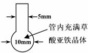 将一根长度约为12cm-14cm的玻璃管在酒精喷灯上烧制成如下图所示形状,向其中加入黄色草酸亚铁晶体。再将管口部分加热拉细,然后在酒精喷灯上均匀加热。当草酸亚铁粉末受热完全变黑,立即将管口拉细的部分放在火焰烧熔封闭,这样便得到了高纯度的纳米铁粉。