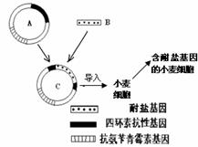 (2)该细菌所含的耐盐基因可通过酶切法获取,作为基因工程中的目的基因导入小麦中,其过程如右图所示。其中A为 ,耐盐基因的小麦细胞还应经过 ,在此过程中还将使用 两种植物激素,从而最终可获取含耐盐基因的小麦植株,当然这些小麦植株并不一定具有耐盐的特性,这是因为