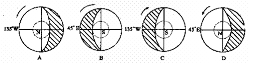 8、与上图对应的太阳光照图正确的是(图中阴影部分表示黑夜)