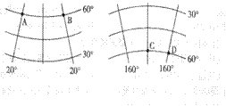 右图是以极点为中心的俯视图,AB是晨线,CD是日界线。读