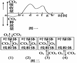 图一是八月份某一晴天,一昼夜中棉花植株CO2的吸收和释放曲线;图二表示棉花叶肉 细胞两种细胞器的四种生理活动状态。请分别指出图一中表示时间的字母与图二中(1)、