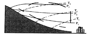 (3)下图为“成都西北部某地某时刻气压和气温分布图”(图中实线为等压线,虚线为等温线)。写出P1、P2、P3值的大小关系;判断此时是白昼还是夜晚;并在黑粗线上标注箭头,表示大气运动方向。(6分)